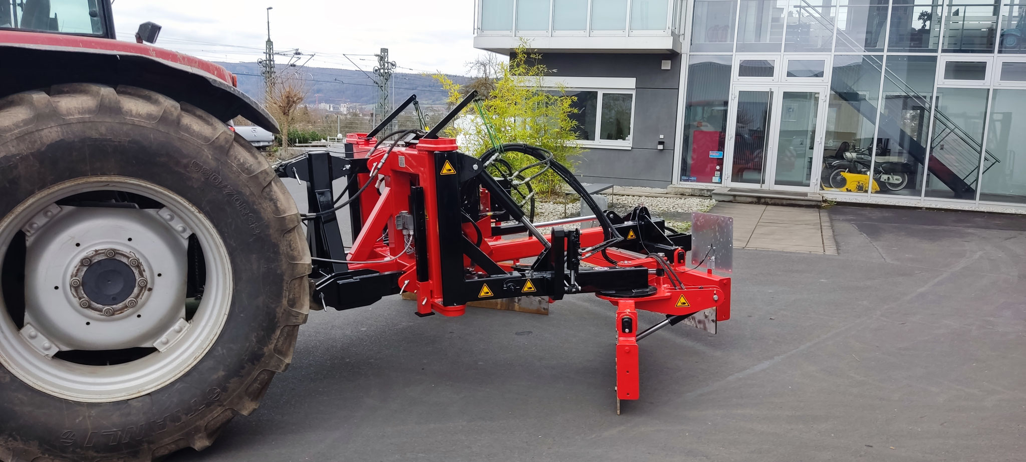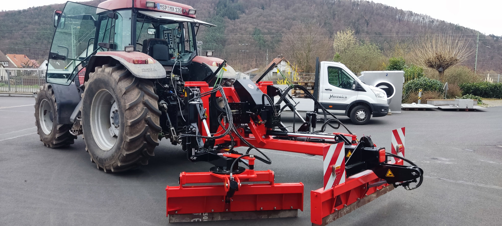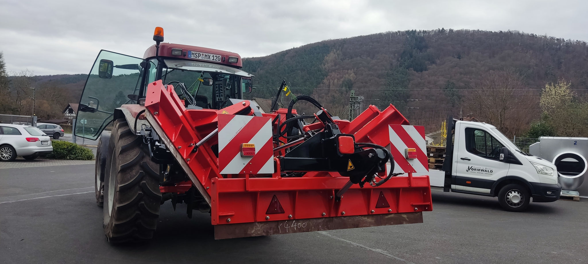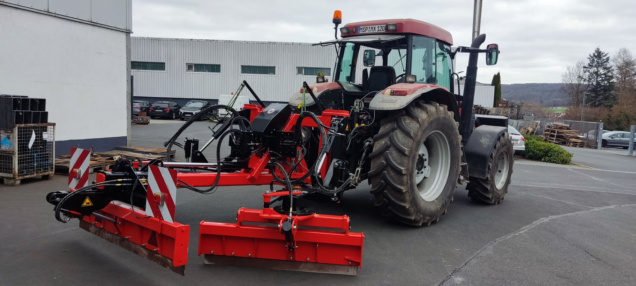 Im Normalfall wird das Gerät am Schlepper in Schwimmstellung gefahren und das volle Gewicht von 2to drückt auf die beiden Schilder links und rechts, also jeweils mit ca 1to.